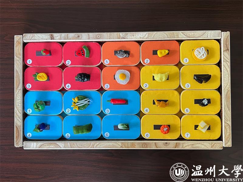 食物对对碰教玩具有三种不同的玩法,第一种玩法是将不用类型的食物轻黏土模型粘贴在相应颜色木块上,以初步了解每类食物在餐盘中的比例。第二种玩法是食物华容道,即当碰到相同类型食物,就可将其取出。第三种玩法是食物消消乐,即将不同类型食物卡片粘贴在木块背面,当幼儿翻开两块相同类型食物木块时,就将其拿走。最后谁拿到的卡片最多,谁就是赢家。