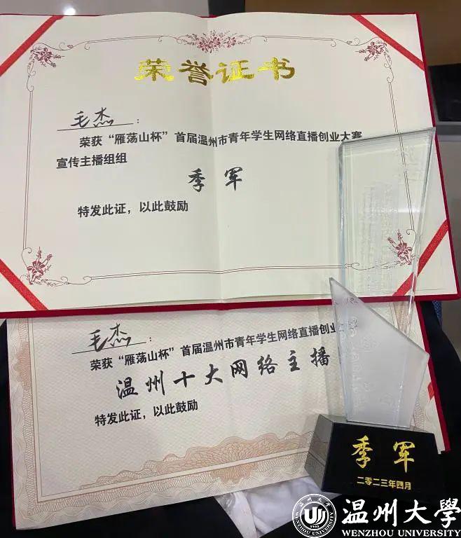 近日,“雁荡山杯”首届温州市青年学生网络直播创业大赛决赛于浙江安防职业技术学院举行,亚洲无码 教育学院学子毛杰获“宣传主播组”季军并获温州市“十大网络主播”荣誉称号。