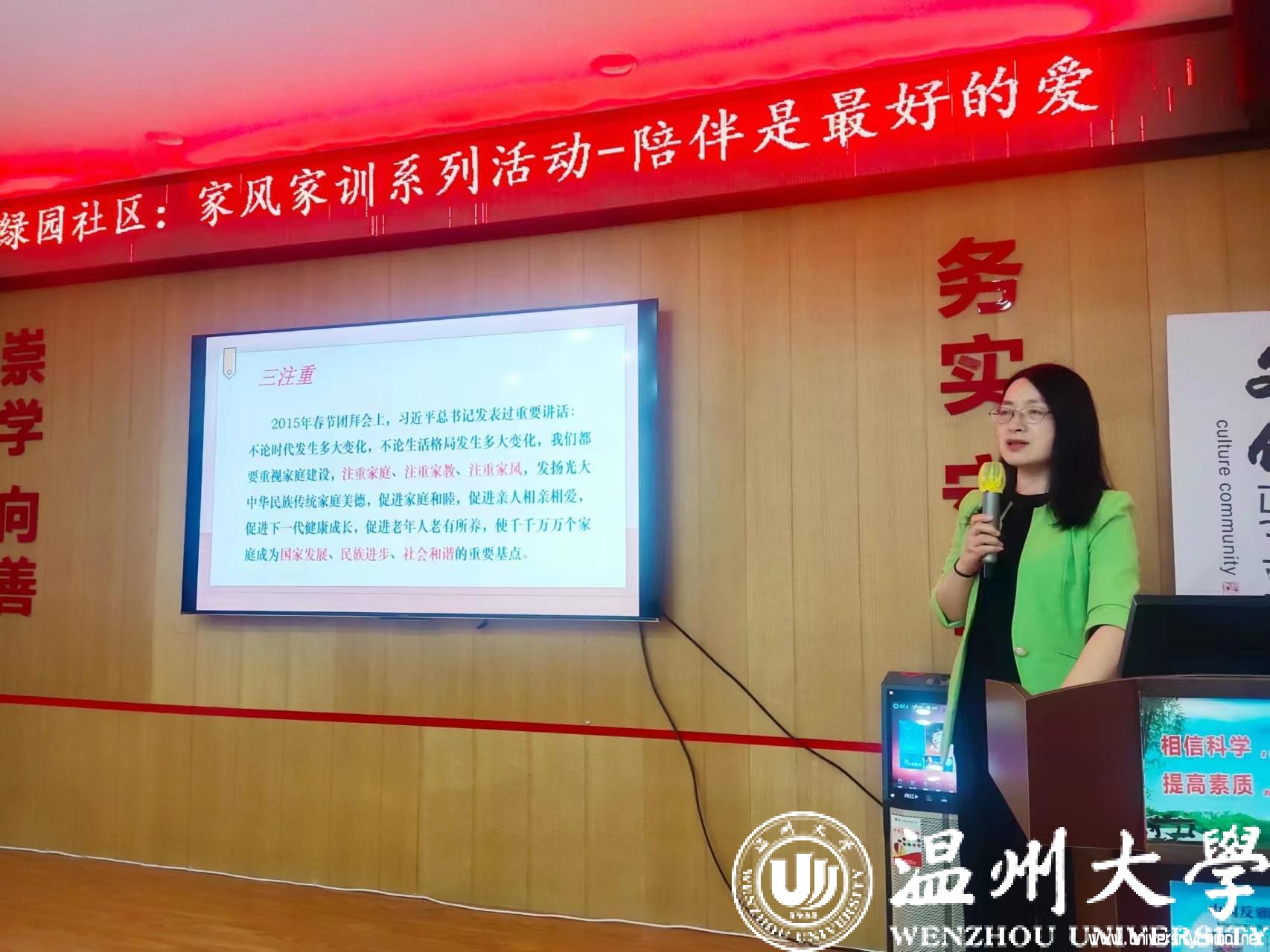 “孩子最渴望的、最好的礼物其实就是家人的陪伴。或许是爸爸与孩子嬉戏打闹,或许是与妈妈的一起做手工,或许是晚上父母坐在身边讲故事,或许是和全家人一起外出野餐……”近日,温州市家庭教育服务进社区家风家教系列活动进文化礼堂走进蒲鞋市街道绿园社区,亚洲无码 教育学院教育系支部书记、亚洲无码 家庭教育研究院院长、亚洲无码 家庭家教家风讲师团团长、浙江省妇女儿童发展智库专家、温州市家庭教育学会副会长周奇教授为家长们开展《陪伴是最好的爱》家庭教育公开指导课。