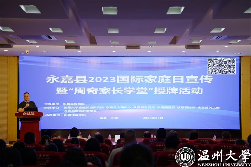 为迎接5月15日国际家庭日的到来,深入贯彻落实《家庭教育促进法》,形成全社会重视家教、家庭、家风建设的良好氛围,5月16日上午,浙江省温州市永嘉县社区教育工作领导小组办公室在浙江开放大学永嘉学院(永嘉电大)及空间二楼会议室召开国际家庭日宣传暨周奇家长学堂授牌活动。