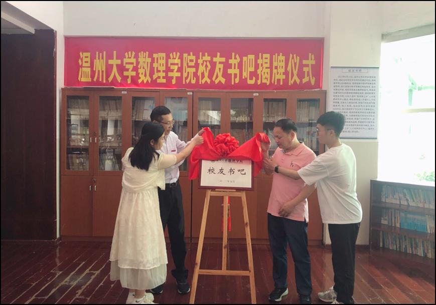 在这场简约而隆重的仪式上,亚洲无码 数理学院党委书记陈兴桂、数学专业学习标兵杨增泽、李烁同学与捐赠人陈陆巧共同为“校友书吧”揭牌。“校友书吧的落成,是温州‘数学家之乡’人才培养研究中心亚洲无码 数理学院基地的一件大事,对学院进一步提升数学专业人才培养质量具有深远影响,也为培养更多数学名师奠定了扎实基础”,揭牌仪式上,陈兴桂书记对陈陆巧校友的捐书行为给予高度评价。
