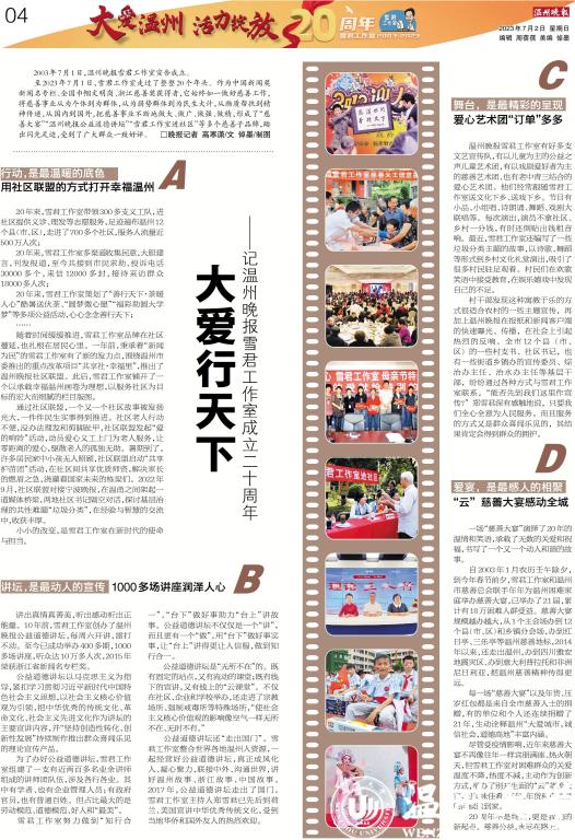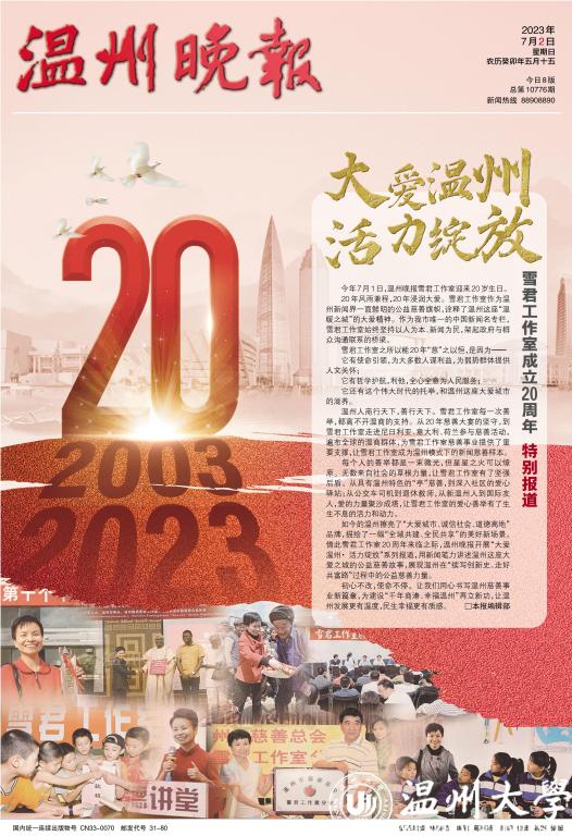 如今的温州擦亮了“大爱城市、诚信社会、道德高地”品牌,描绘了一幅“全域共建、全民共享”的美好新场景。借此雪君工作室20周年来临之际,温州晚报开展“大爱温州· 活力绽放”系列报道,用新闻笔力讲述温州这座大爱之城的公益慈善故事,展现温州在“续写创新史、走好共富路”过程中的公益慈善力量。