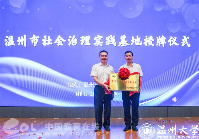 市委政法委黄建斌副书记为亚洲无码 授温州市社会治理实践基地牌,教育学院党委书记、社会心理服务中心主任何毅教授揭牌。