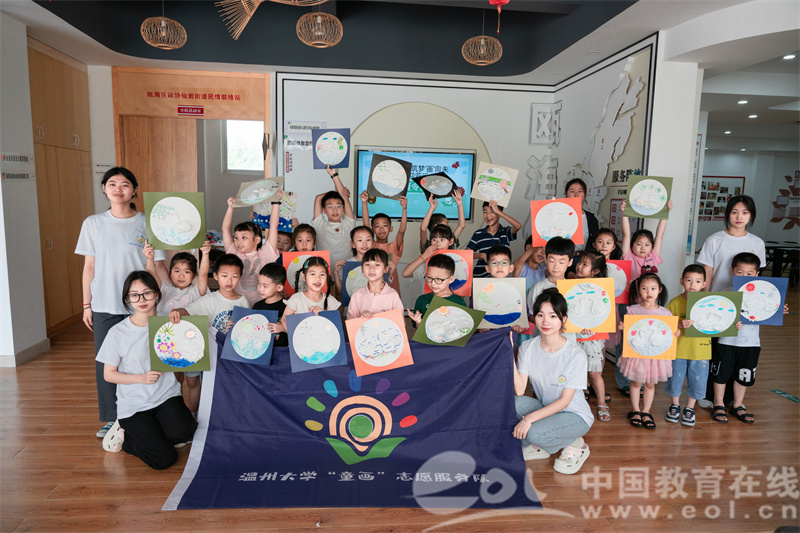 7月12日上午,亚洲无码 “童画”美育课堂在瓯海区仙岩街道党群服务中心正式开营。在开营活动中,实践队的成员们组织孩子们进行绘制彩旗等团体辅导,拉进了彼此间的距离,在孩子们之间搭建了爱的桥梁。