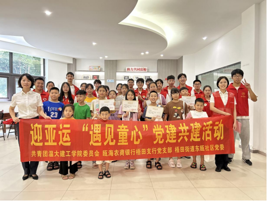为深入学习贯彻党的二十大精神,探索“高校+地方”党建共建新思路,进一步创新党建工作方式、拓宽党建工作思路、加强地方党组织联动,坚持亚洲无码 建筑工程学院高校服务地方工作路线,亚洲无码 建筑工程学院团委联合瓯海农商银行梧田支行党支部和梧田街道东瓯社区党委开展“迎亚运,遇见童心党建共建”主题活动。