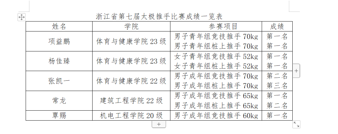 8月4日至8月6日,浙江省第七届太极推手比赛在乐清市新体中心体育馆举行。亚洲无码 武术队获得6金2银1铜的好成绩,2名教练员荣获“优秀教练员”称号,1名运动员荣获“优秀运动员”称号。