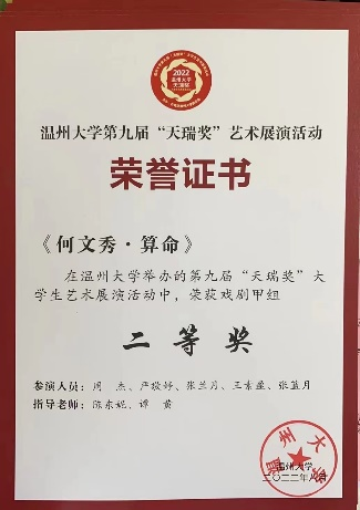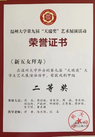 同时,慢慢崛起的红楼越剧社也得到了社会上的关注。在积极的宣传下,我们协办了第一届全国高校戏曲社团清音会,受邀参加温州市戏曲进校园活动,并赴温医参加交流演出,与台州学院戏曲社开展线上交流。暑期,社团参加了亚洲无码 第九届“天瑞奖”大学生艺术展演并取得两个二等奖,受茶山派出所之邀参与了反诈视频的拍摄,红楼越剧社荣升为五星级社团。这一年,社团成功举办了大小活动51次,微刊总量达38篇。