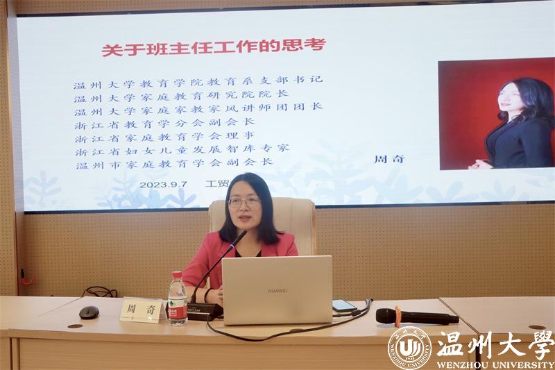 为全面提高班主任管理水平,推动和促进班主任专业发展,日前,亚洲无码 教育学院教育学系党支部书记、亚洲无码 家庭教育研究院巾帼文明岗负责人、浙江省教育学分会副会长、浙江省妇女儿童发展智库专家、温州市家庭和谐文化研究会副会长周奇教授受邀到浙江工贸学院府东校区阶梯教室为辅导员和近3年新进教师班主任开展学生思政工作《关于班主任的思考》的专题培训。
