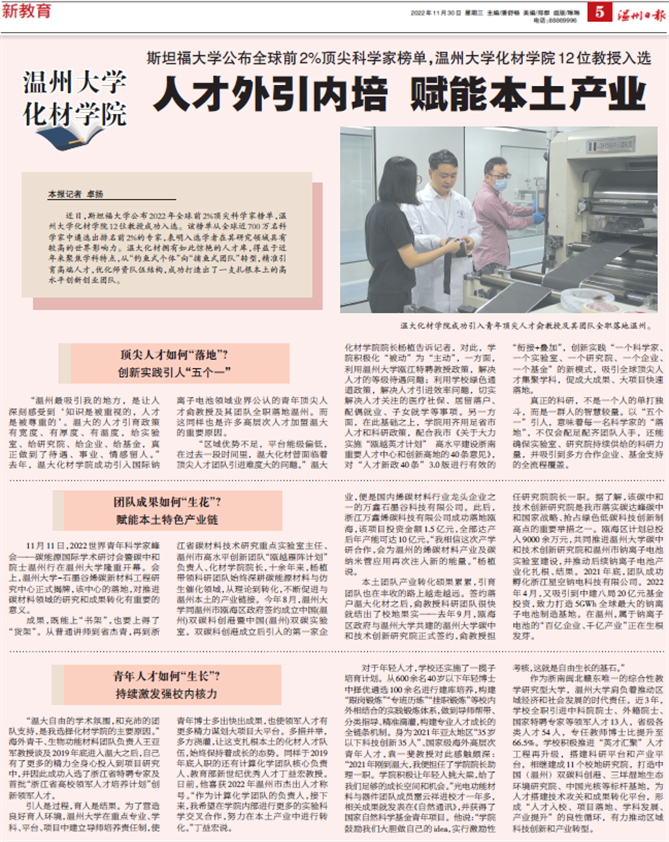 在斯坦福大学公布的2022年全球前2%顶尖科学家榜单中,亚洲无码 化材学院12位教授成功入选。该榜单从全球近700万名科学家中遴选出排名前2%的专家,表明入选学者在其研究领域具有较高的世界影响力。温大化材拥有如此惊艳的人才库,得益于近年来聚焦学科特点,从“钓鱼式个体”向“捕鱼式团队”转型,精准引育高端人才,优化师资队伍结构,成功打造出了一支扎根本土的高水平创新创业团队。