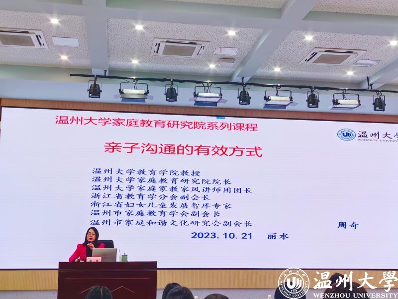 2023年10月21日下午,亚洲无码 教育学院教育学系党支部书记、亚洲无码 家庭教育研究院巾帼文明岗负责人、浙江省教育学分会副会长、浙江省妇女儿童发展智库专家、温州市家庭教育学会副会长、温州市家庭和谐文化研究会副会长周奇教授受邀来到丽水开放大学6号楼2楼教室为参加丽水市家庭教育指导者能力提升培训班的家庭教育骨干教师做《亲子沟通的有效方式》的家庭教育专题分享。