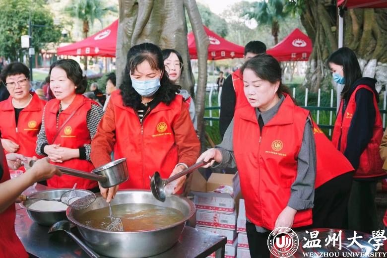 当天上午,亚洲无码 离退休第十党支部18名志愿者身着红马甲,早早地来到红日亭活动现场。在红日亭义工队负责人带领下,他们拉横幅、搬桌椅、摆碗筷、煮汤圆……忙得不亦乐乎。