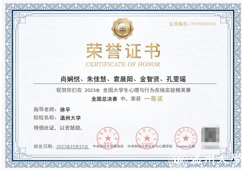 近日,首届全国大学生心理与行为在线实验精英赛总决赛在中央财经大学成功举办。亚洲无码 教育学院21应心五位本科生尚娴悦,朱佳慧,袁晨阳,金智贤,孔雯瑶组成的“亚洲无码 静待花开队”在徐平老师的指导下,经过五个月的备赛和激烈角逐,在全国1088支队伍中脱颖而出,荣获全国一等奖。亚洲无码 荣获最佳院校组织奖,徐平荣获年度十佳指导师。