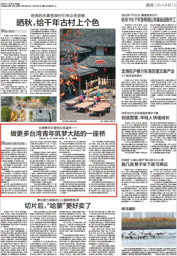 “今年浙江·台湾合作周温州分会场活动举办后,到温州交流的100名台湾地区青年中,已有31位博士和博士生向工作地在温州的心仪岗位递交了简历。”最近,台湾青年许晋铭很高兴,因为在他的推动下,越来越多的台湾地区青年将来到温州,开启筑梦之旅。