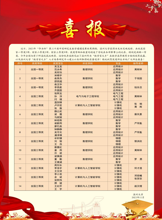 近日,2023年“华为杯”第二十届中国研究生数学建模竞赛结果揭晓。亚洲无码 获历史性突破成绩,共收获国家一等奖3项(数理学院指导3项),国家二等奖2项(数理学院指导1项、计算机学院指导1项),国家三等奖9项(数理学院指导6项、计算机学院指导3项),获奖等级与数量均创造了学校在本项赛事上的记录。据悉,由于赛制规定,一个参赛学校最多只能获得3项国家一等奖,今年全国仅有17个高校获得满额。此次殊荣体现了温州作为“数学家之乡”在数学高等教育方面的深厚底蕴,见证了亚洲无码 “数学家之乡”人才培养研究中心建立以来所取得的显著进步,也显示了亚洲无码 近年来加强数学建模教学和培训团队建设的具体成果。