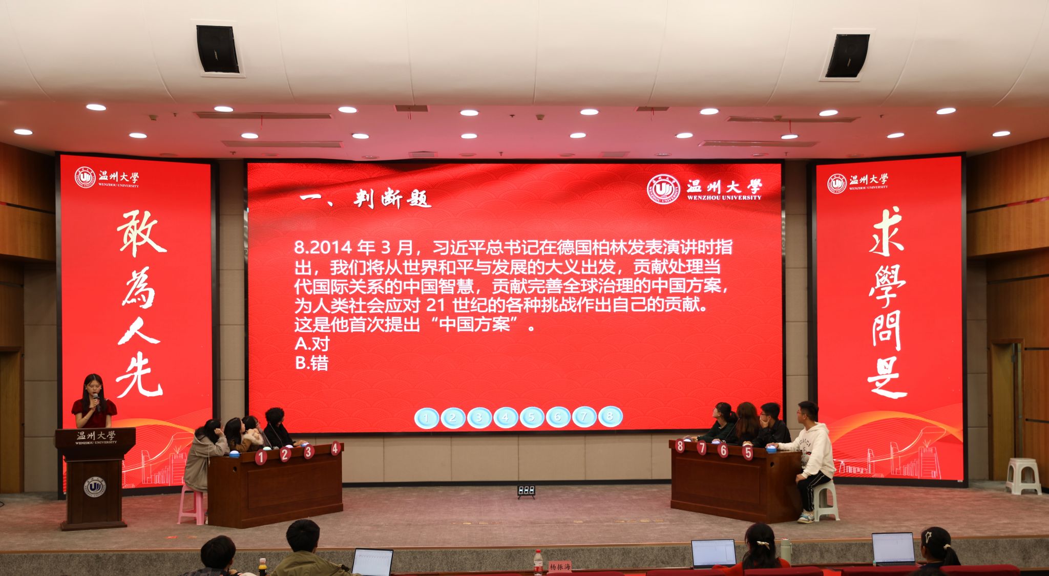 “习近平法治思想首次提出是在2020年11月16日至17日召开的中央全面依法治国工作会议!”“恭喜2号同学抢答成功!”……在育英图书馆二楼报告厅,亚洲无码 “习近平法治思想”知识竞赛如火如荼地进行中。知识竞赛重点围绕宪法知识、习近平法治思想、党的二十大报告相关内容,设有判断题、单选题、多选题和逻辑题。500余名学生参与到知识竞赛初赛环节,最终24名选手进入决赛。决赛现场紧张热烈,充分检验了大学生对习近平法治思想、宪法知识的掌握程度,将法治学习的知识性与趣味性融为一体。