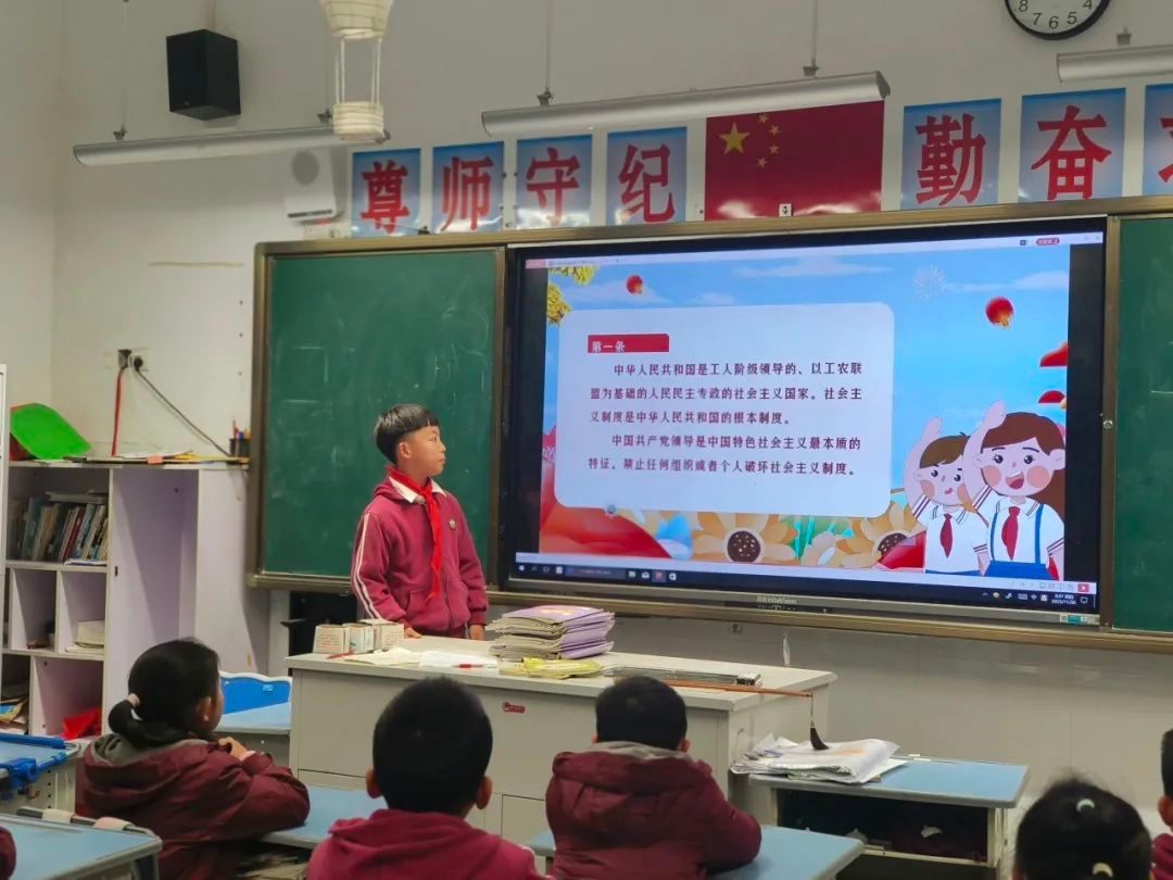台州市椒江区云健小学通过开展中队里读宪法、国旗下读宪法、板报中话宪法、视频上知宪法等活动,组织学生学习相关宪法条目,弘扬宪法精神。