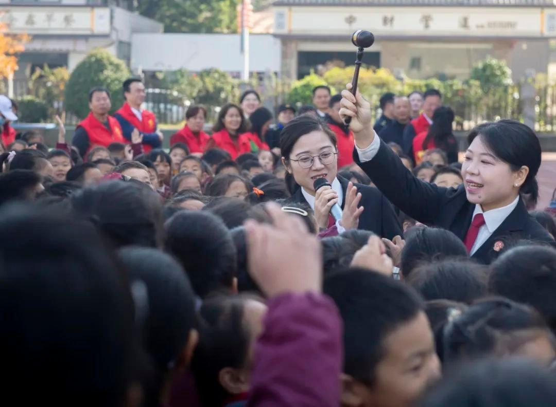 金华市婺城区长山乡中心小学国家宪法日主题教育活动现场,婺城区人民法院白龙桥法庭副庭长展示介绍了法袍、法槌、法徽等,并带领480多名师生举起右拳庄严宣誓,共同传递宪法信仰和法治精神。