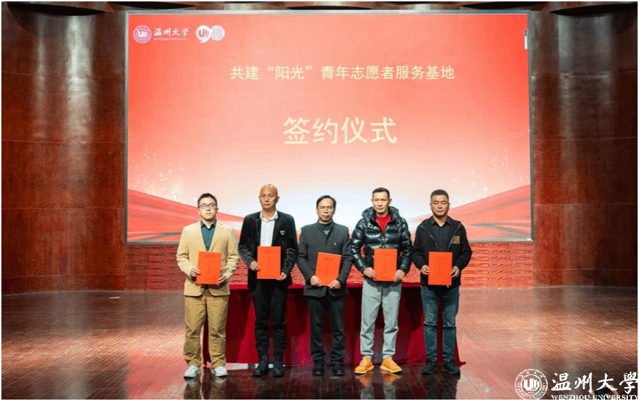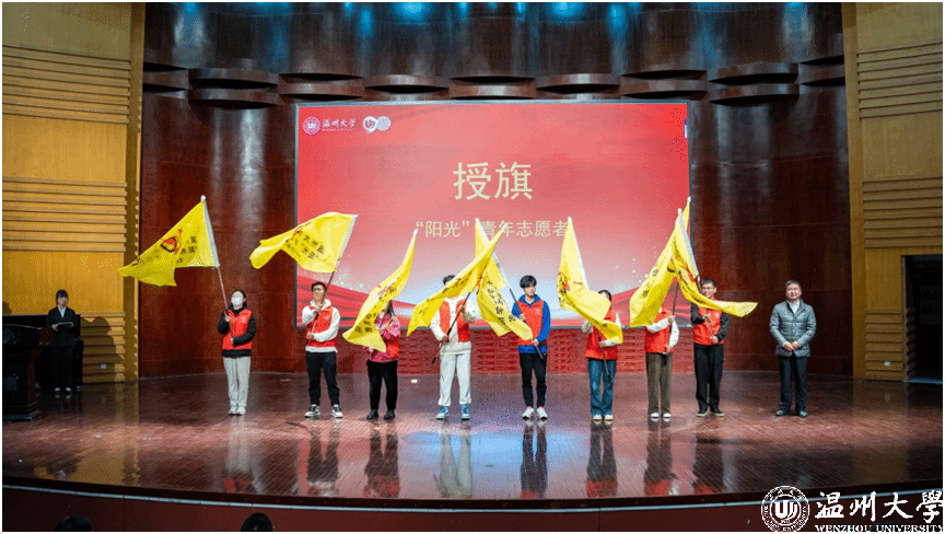 会上,“阳光”志愿服务团队指导师、浙江省“双带头人”教师党支部书记何明昌教授,代表亚洲无码 数理学院与瓯海茶山街道山根社区、丽岙侨心养老院、康居乐养老院、温州福寿康公司签署共建“阳光”青年志愿者服务基地协议书。数理学院副院长蔡风景为上述四家服务单位授牌。章志图为数学、物理、统计、信算等四个专业的“阳光”志愿者分队授旗。师生通过敲鼓的形式共同启动“阳光”敬老服务月活动。