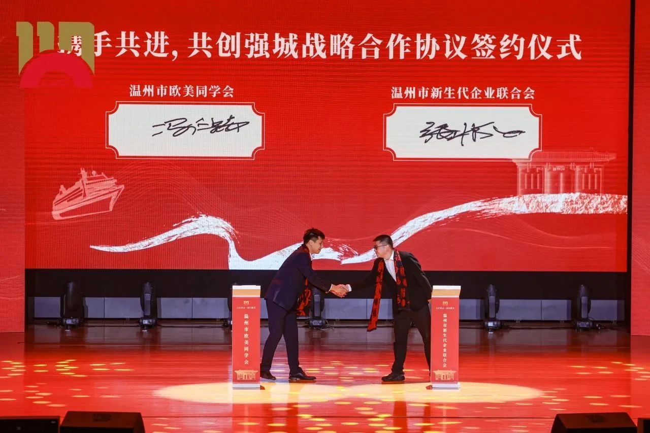 温州市欧美同学会与温州市新生代企业家协会,签订《携手共进 共创强城战略合作协议》,标志着这两家充满创造活力的青年组织,将紧紧围绕“强城行动”,发挥各自所长,更加紧密地团结合作、资源共享,共同助推温州高质量发展,共同唱响“强城有我 海归担当”最强音。