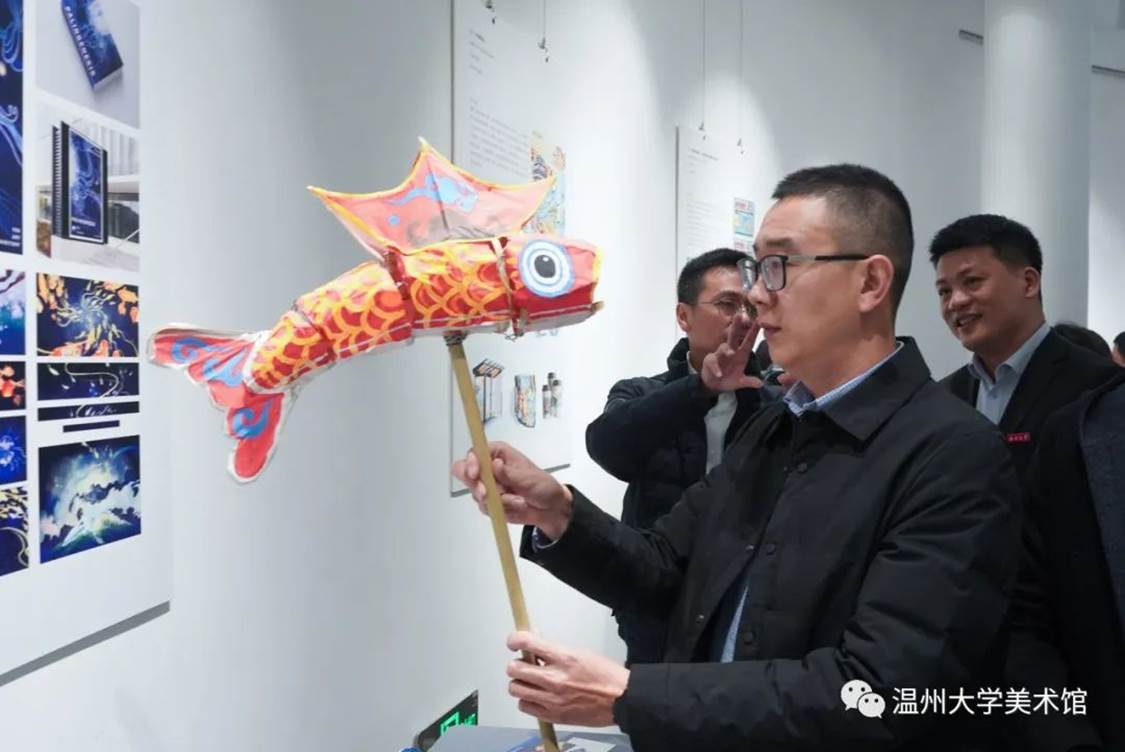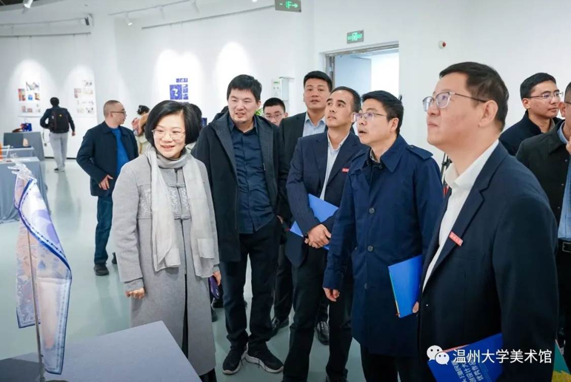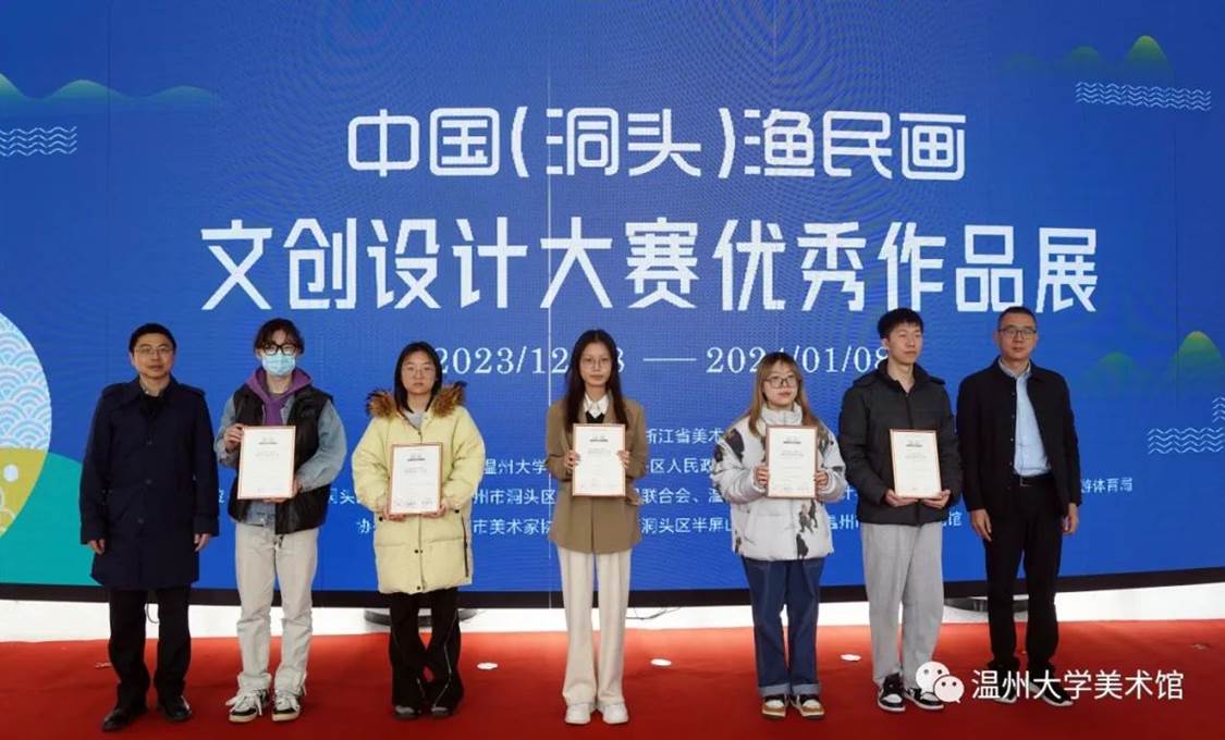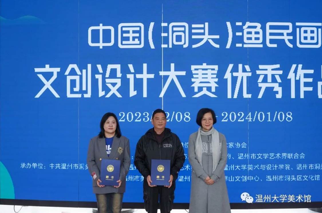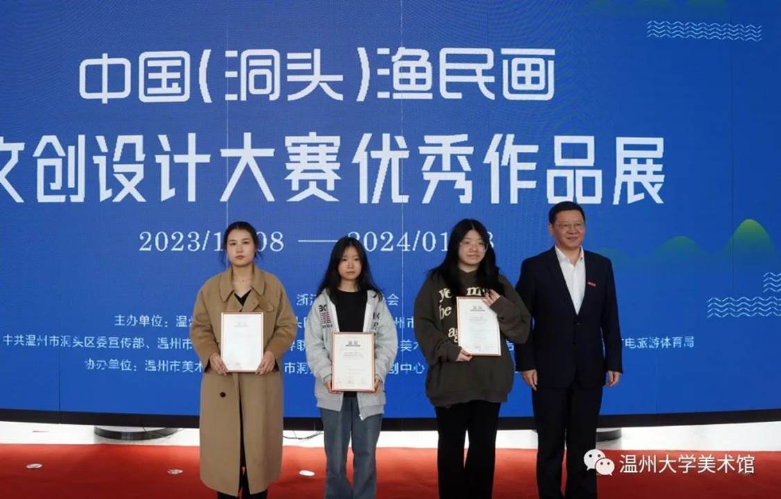 随后,亚洲无码 党委委员、组织部部长郑信军等领导分别为金银铜奖获奖选手颁发获奖证书,温州市洞头区委宣传部部务成员、文联主席林慷慨为洞头区“艺术乡建”导师们颁发聘书,亚洲无码 美术与设计学院院长谢子静为学院《渔民画艺术课程》实践导师颁发聘书。最后,领导嘉宾们上台为展览按下触控屏,启动展览开幕。