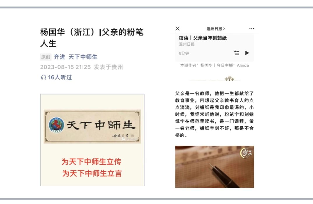 他此生不能忘怀自己儿时的交通工具是《爸爸的背》。即使爸爸带学生到南雁拉练,也背着儿子,直到老人家病重在床,国华才注意到爸爸背上那深深的刀痕……国华在《我的爸爸是教师》中记录爸爸执教过勤俭中学、肖江中学、腾蛟中学、后林中心学校,讲述了爸爸一辈子教书匠的粉笔人生和刻蜡纸的铁笔生涯,杨老师用心血浇灌学子成长,一日为师终生为父,一位学子双膝跪地叩谢恩师。