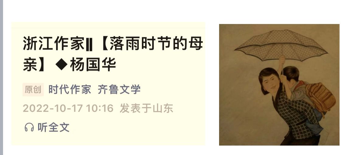 国华在《落雨时节的母亲》含泪回忆,一次母亲在给国华送帽子路上,发现一位母亲背着一个小孩儿匆忙赶路,那位母亲只穿着湿答答的单薄内衣,棉衣披在孩子头上,母亲伸手为她们打伞,深一脚浅一脚的跌倒摔伤,她忍着疼痛,一直打伞把那陌生母子送到诊所。国华永远记得,落雨天母亲一遍又一遍叮嘱,小道上看到对面有人挑着担子过来的,要早些退到田埂上让挑担人先过,过桥也要让别人先过,过桥时自己手里的伞一定要折拢。直到现在,国华打伞走在城市宽阔的桥面上,不管风雨多么吹打,他都会将雨伞折拢,慈母那万般疼爱,慈母落雨天的那百般叮咛,永远折拢在儿子心田……