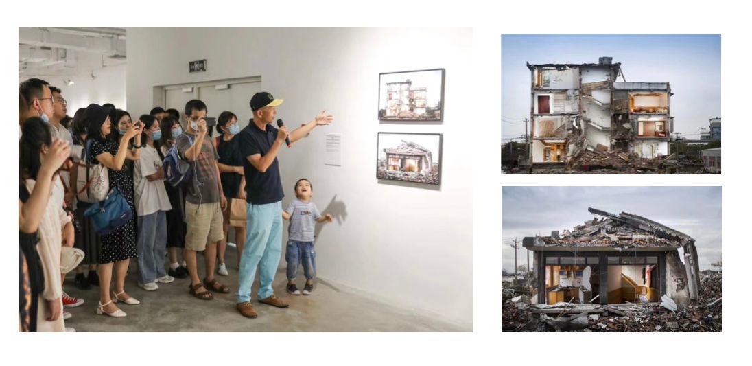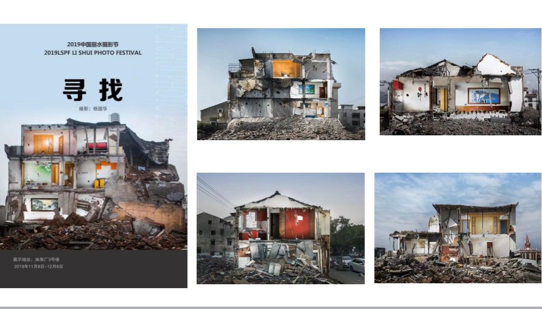 我被国华获得三影堂摄影奖、中国“伯奇杯”摄影奖、浙江纪实摄影大展的《寻找》震颤,似乎听到老宅倒下时断断续续的临终遗言,似乎看到房子主人临别时的仓惶和无奈,断壁残垣中的结婚照和锅碗瓢盆孤儿般的被遗弃。