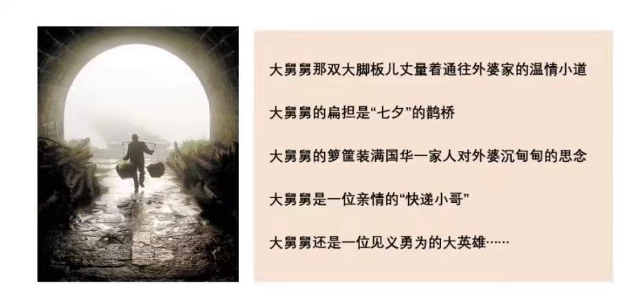 国华笔下多次提到外婆家可爱的大舅舅,到他家总是晃荡着来,晃荡着走,用那双大脚板儿丈量着通往外婆家的温情小道,大舅舅的到来是国华儿时解馋“舌尖”的期盼,大舅舅的扁担是“七夕”的鹊桥,大舅舅的箩筐装满国华一家人对外婆沉甸甸的思念,大舅舅是一位亲情的“快递小哥”,大舅舅还是一位见义勇为的大英雄……