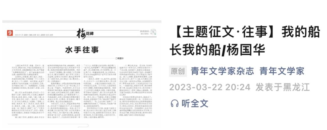 那是80年代末的夏日,国华在中国第一艘浅水万吨轮当三副,船泊葫芦岛维护保养。一次他和同事下海游泳遇险被一位老渔民救起,国华摘下身上最值钱的手表以谢救命之恩,后来才听船厂的人说,老渔民每天手编渔网眼盯海面,直到他们平安上岸,才会放心去做其他事情。国华在《记忆中的老手表》中回顾了这段铭心往事,写到老渔民之前看到他戴着手表下水时:“两片如礁石裂缝的嘴唇里,会发出嗡嗡的响声。”写到救他们上岸,看到国华手表完好无损时:“老渔民的嘴巴裂嘣如天空刚刚打开乌云那一抹的阳光,灿烂如花。”守望年轻海员的下水上岸,老渔民的嘴一会儿“礁石裂缝”,一会儿“灿烂如花”……
