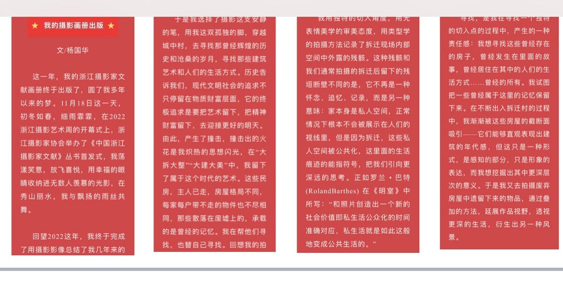 国华用镜头娇宠爱妻,也用《40年夫妻的第一次合影》记录了别人家的“红宝石”之爱。在温州瓯海区三垟街道黄屿村一对来自河南信阳的中年夫妇,经营一个用劈柴烧水的锅炉房,五毛一瓶一元一桶为周围民工提供热水。国华听说她们夫妇结婚四十年没拍过合照,就欣然抽了一个周六帮他们完成心愿。国华原味记录了40年一遇的真爱画面:“陈大姐双眼眯缝得看不到眼珠子,嘴角都快上扬到耳朵了,只见她纯红的对襟大褂,黑色的裤子黑色的皮鞋,一对金灿灿的耳环垂挂在耳边,左手是金手环,右手是玉手镯,短发服服帖帖地盖着,明显看出吹烫过。徐大哥上身穿着休闲的西装,下身是牛仔裤,白色的运动鞋,帅气不经意间焕发出来,花白的头发,刚刚洗过,还带着湿润的气态。陈大姐看我的眼睛散发着赞许的光彩,忙与我解惑,她说自己身上的,是女儿给她买的,老头子身上的,是借女婿的。还不时地用左右手相互搓一下金手环与玉镯。”“我不断地调节气氛,指挥两个人紧紧挨在一起。陈大姐往徐大哥身边挨紧时,徐大哥轻轻哆嗦一下,两脚往边上移了一点,陈大姐拧了一下他的手臂,他才挺了一下胸膛,站立不动。”