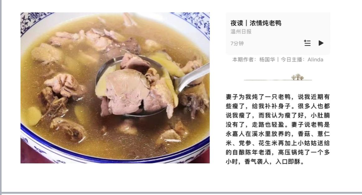 《浓情炖老鸭》中则写了一只番鸭和四位母亲的故事。国华瘦了妻子炖老鸭补身子,父亲累了母亲炖老鸭犒劳,先给爷爷留一碗,三兄妹各一碗,母亲说自己从小就不喜欢吃鸡鸭……一次母亲挑一只全身洁白的大番鸭,扎上红头绳,进城到温州看从小带大自己的姐姐,一个中年男子追着要买母亲手里的番鸭,一直跟到小南门虞师里国华姨妈家门口,反复说明他母亲病重快不行了,就想吃口正宗的老酒炖老鸭,为母亲的最后心愿他已在南站等了3天。有感他的一片孝心,姨妈嘱他晚上来把炖好的老鸭端给母亲……那个人给国华母亲和姨妈鞠了好几个躬,走到楼梯的拐弯处还在深深地鞠躬,国华笔下的一只番鸭和四位母亲,讲述了孝心孝子和贤妻良母的传统美德。