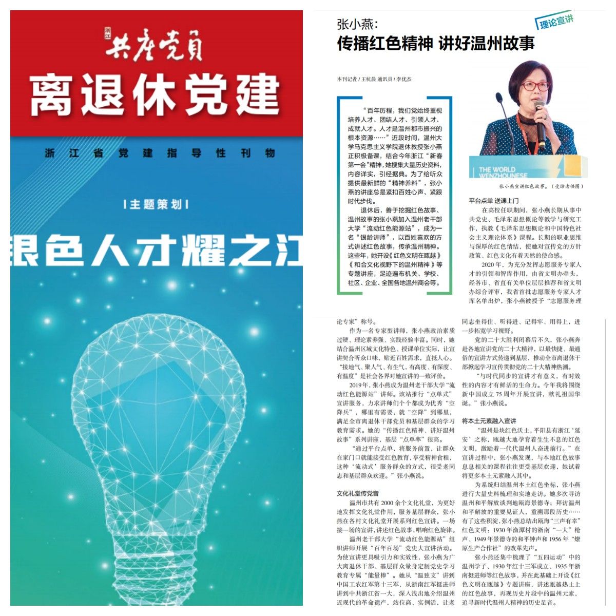 “百年历程,我们党始终重视 培养人才、团结人才、引领人才、 成就人才。人才是温州都市振兴的根本资源……”近段时间,温州大 学马克思主义学院退休教授张小燕 正积极备课,结合今年浙江“新春第一会”精神,她搜集大量历史资料,内容详实,引经据典。为了给听众提供最新鲜的“精神养料”,张小 燕的讲座总是紧扣百姓心声、紧跟时代步伐。
