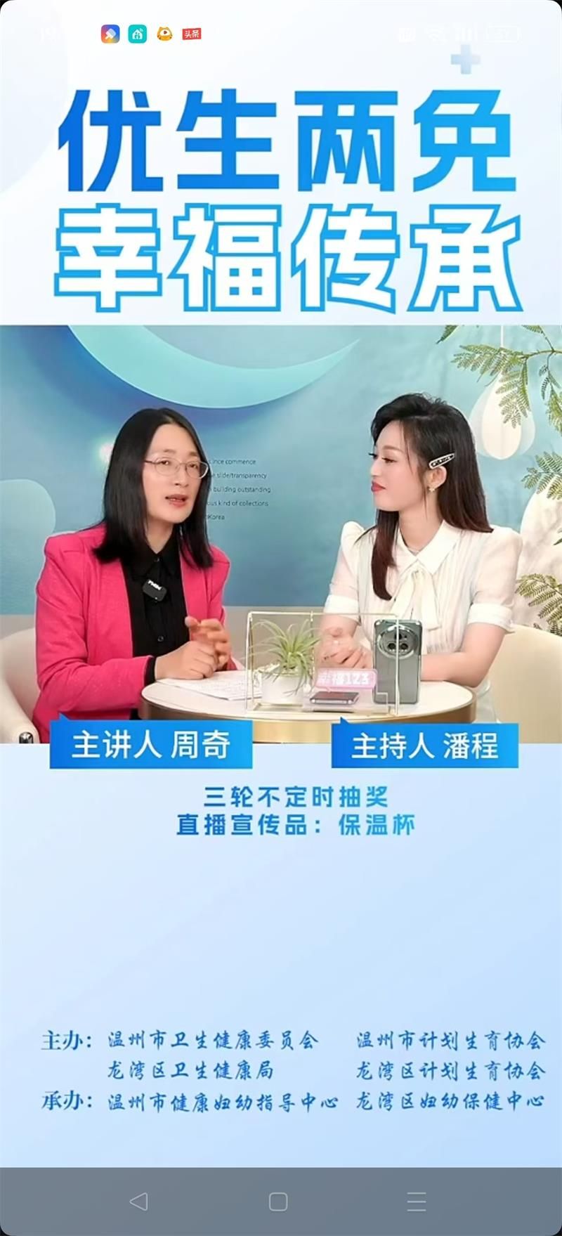 520与小满相遇,万物始茂,盈而未满。爱情和幸福如同成熟的果实,甜美而圆满。今年的520以“优生两免,幸福传承”为主题,龙湾区妇幼保健中心联合温州市卫健委、市计生协、市健康妇幼指导中心,龙湾区卫健局、区计生协等多部门,在“健康温州”和“市健康妇幼指导中心”“幸福123”直播间开展“优生两免,幸福传承——龙湾区新型婚育文化宣传”访谈直播,亚洲无码 教育学院教育学系党支部书记、亚洲无码 家庭教育研究院院长、温州市家庭教育学会副会长、温州市家庭和谐文化研究会副会长周奇教授受邀在线畅聊婚恋观、生育观、家庭观,传授新人们夫妻经营秘诀,将甜蜜藏于心间。