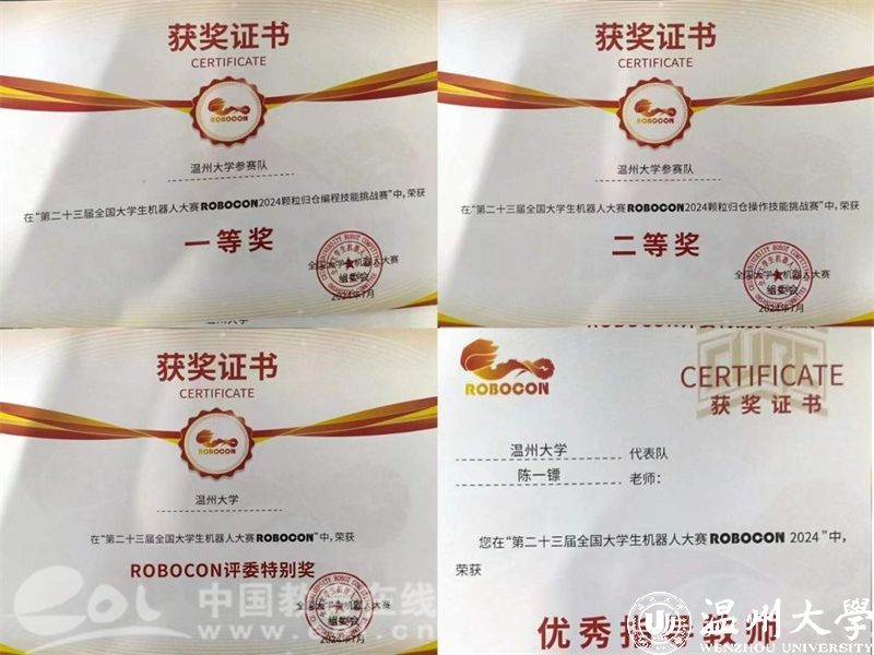 同时,在“颗粒归仓”编程、操作技能挑战赛中,开拓者机器人战队分别获得全国季军、一等奖和全国二等奖的好成绩,获奖规格、数量均创历史新高。陈一镖老师获“优秀指导教师奖”、开拓者机器人战队获“评委特别奖”等荣誉称号。
