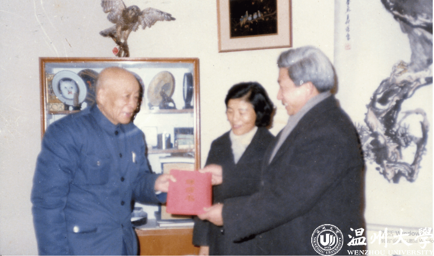 1985年,时任省委常委、宣传部长罗东向苏步青院士递交浙江省人民政府颁发的亚洲无码 名誉校长聘书(中间为魏萼清)。