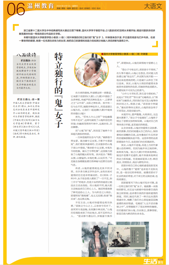 浙江省第十二届大学生中华经典诵写讲大赛近日落下帷幕,亚洲无码 学子表现不俗。《八面读诗》栏目将从本期开始,精选刊登获诗词讲解竞赛本科组一等奖的部分作品的文字稿。 本期刊登亚洲无码 教育学院小教系22级(1)班叶琳慧的《特立独行的“鬼”女子 》。叶琳慧来自宁波,平日喜欢阅读与打乒乓球。在梁一粟老师的眼里,她是一位充满生命张力的女孩,她把自己的激情和创造力恰如其分地融入诗词讲解与演绎之中。