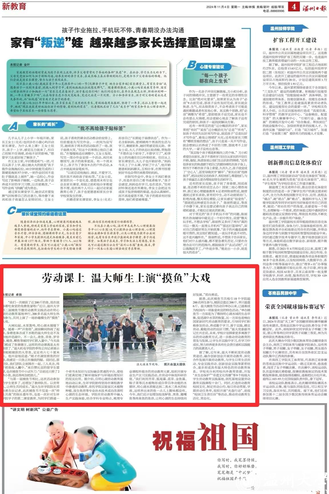 据悉,此次捕鱼节共吸引 18 个学院超 200名师生参与,捕获总重近200斤,单只最重 6斤。温大捕鱼节活动自举办以来,已逐渐成 为校园内一项备受欢迎的特色活动“。举办捕 鱼节一方面是为了维持明心湖水域的生态平 衡,促进湖中水草的恢复,另一方面也是响应 国家新时代劳动教育的要求,引导同学们积 极参加劳动,养成勤于学习、善于实践,踏实 劳动、勤勉劳动的良好习惯。”温大党委副书 记庄兴忠说,未来,学校计划探索更多寓教于 乐的劳动教育方式,进一步推动劳动教育的 普及与发展,让学生在实践中学习,在学习中 成长,努力培养更多具有社会责任感和实践能 力的高素质人才。