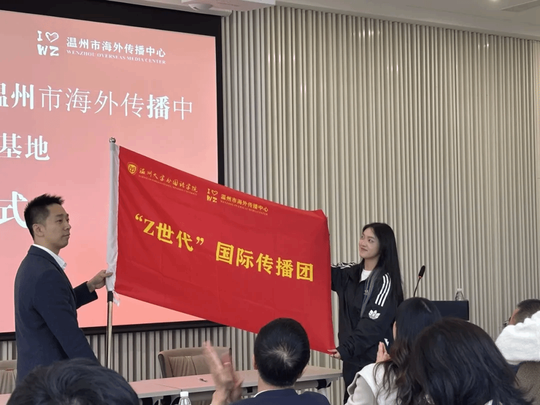 随后,举行了庄重的签约仪式,双方就平台共建、资源共享、价值共创、发展共赢等系列合作事宜签订协议,楼了凡主任和杨丽君书记为温州市海外传播基地颁授大学生校外实践基地牌子,学院还聘请许鹏怀主任担任研究生校外导师和大学生创新创业导师。作为影响社会发展的新生力量,近年来“Z世代”青年在对外交流中逐渐成为主力军,为进一步凝聚国际传播“Z世代”力量,亚洲无码 外国语学院与温州市海外传播基地联合建立“Z世代”国际传播团,来自温大外国语学院英语、翻译、日语专业的25名学生成为团队首批成员。市委宣传部史宇翔处长为传播团授旗,“Z世代”国际传播团队长、温大外国语学院23级翻译专业陈靖谕同学在接旗后表示,“团队将不负重望,积极承担起传播温州文化、中国文化的使命,在新时代语境下创新传播方式,讲好温州故事、讲好中国故事。”