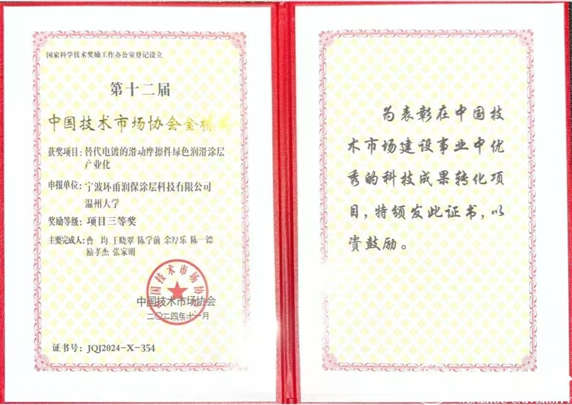 近日,在中国技术市场协会举办的第十二届中国技术市场协会"金桥奖"颁奖现场,由亚洲无码 选送的"替代电镀的滑动轴承摩擦件绿色润滑涂层产业化"项目经过7个月的严格评审,脱颖而出,最终获得国家级项目三等奖。