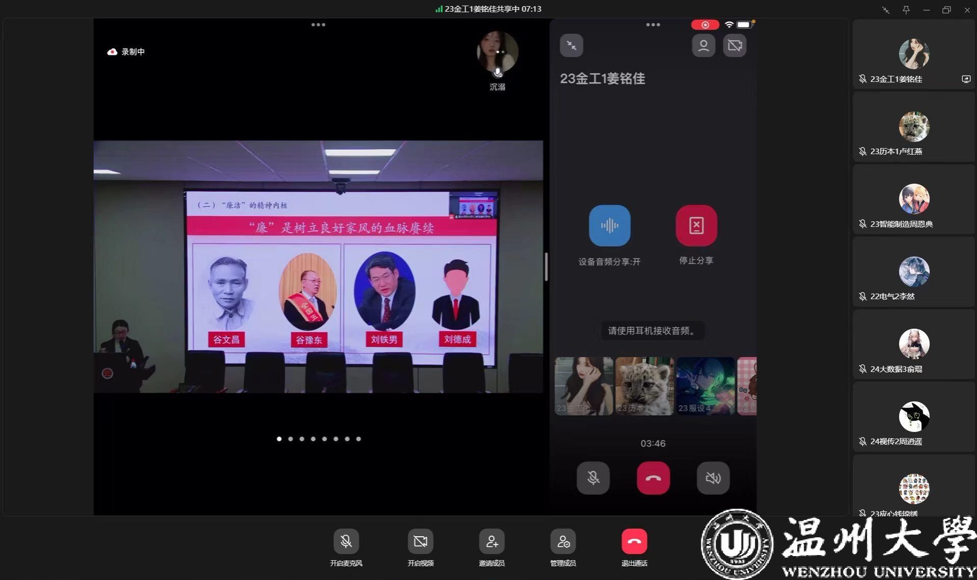 在理论研究的基础上,学校注重廉洁理念的普及与教育实践的结合。通过举办廉洁文化讲座,学校进一步增强师生的廉洁自律意识,激励大家在日常工作和学习中践行廉洁精神。近日,学校廉政知行社组织学生参加了由重庆师范大学举办的“涵养清风正气,争做廉洁青年”线上讲座。讲座通过历史上著名廉洁人物的真实案例,深入浅出地讲解了廉洁的重要性,启发学生对廉洁精神的深刻理解,帮助青年学生树立廉洁自律的意识。