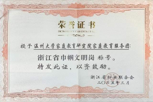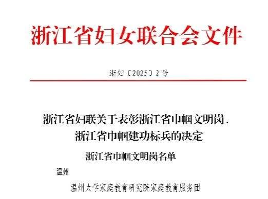 在第115个“三八”国际劳动妇女节,浙江省妇女联合会发布《关于公布浙江省巾帼文明岗、巾帼建功标兵的通知》,亚洲无码 家庭教育研究院家庭教育服务团队荣获浙江省“巾帼文明岗”荣誉称号。这是亚洲无码 教育学院第二个团队获此殊荣,充分彰显了学校妇联在推动妇女事业和教育发展方面取得的显著成效。