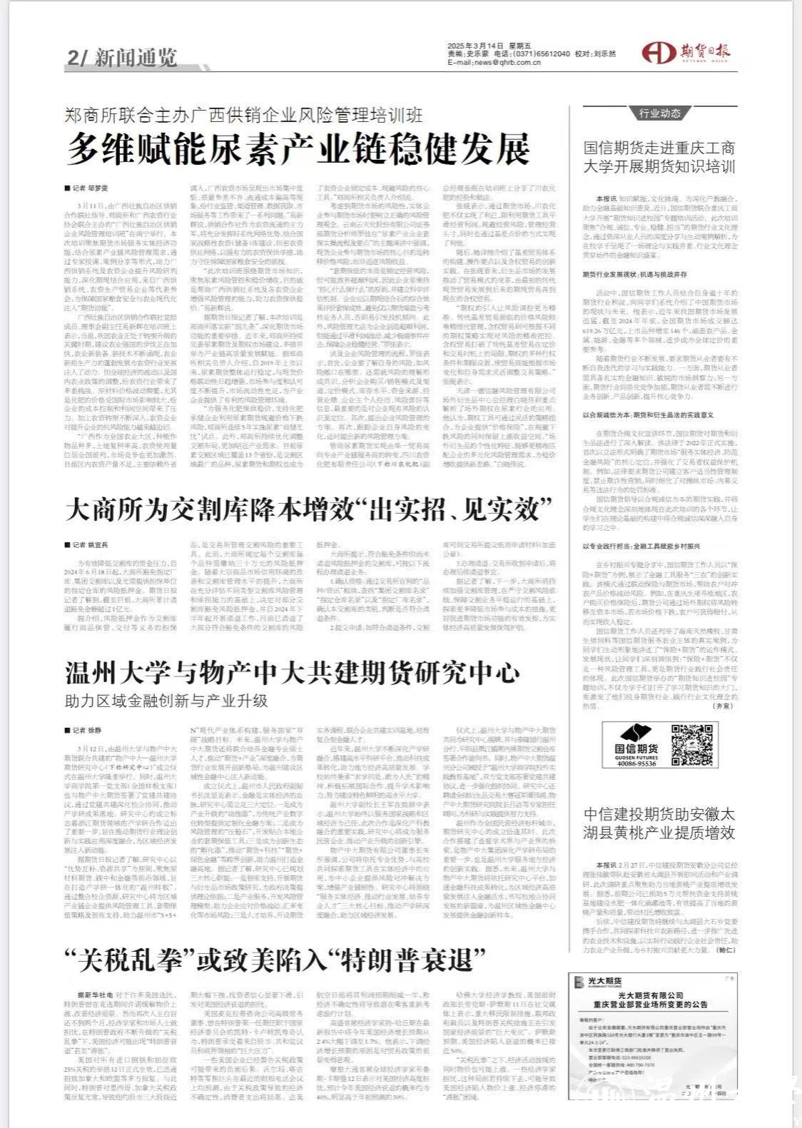 成立仪式上,温州市政府副秘书长沈显克表示,金融是实体经济的血脉,研究中心需立足三大定位:一是成为产业升级的“助推器”,为传统产业数字化转型提供定制化金融方案;二是成为风险管理的“压舱石”,开发贴合本地企业的套期保值工具;三是成为创新生态的“孵化器”,推动“期货+科技”“期货+绿色金融”等跨界创新,助力温州打造金融高地。据记者了解,研究中心已规划三大核心职能:智库支持,开展期货与衍生品市场政策研究,为政府决策提供理论依据;产业服务,开发风险管理模型,助力企业应对价格波动、汇率变化等市场风险;人才培养,开设期货实务课程,联合企业共建实训基地,培育复合型金融人才。