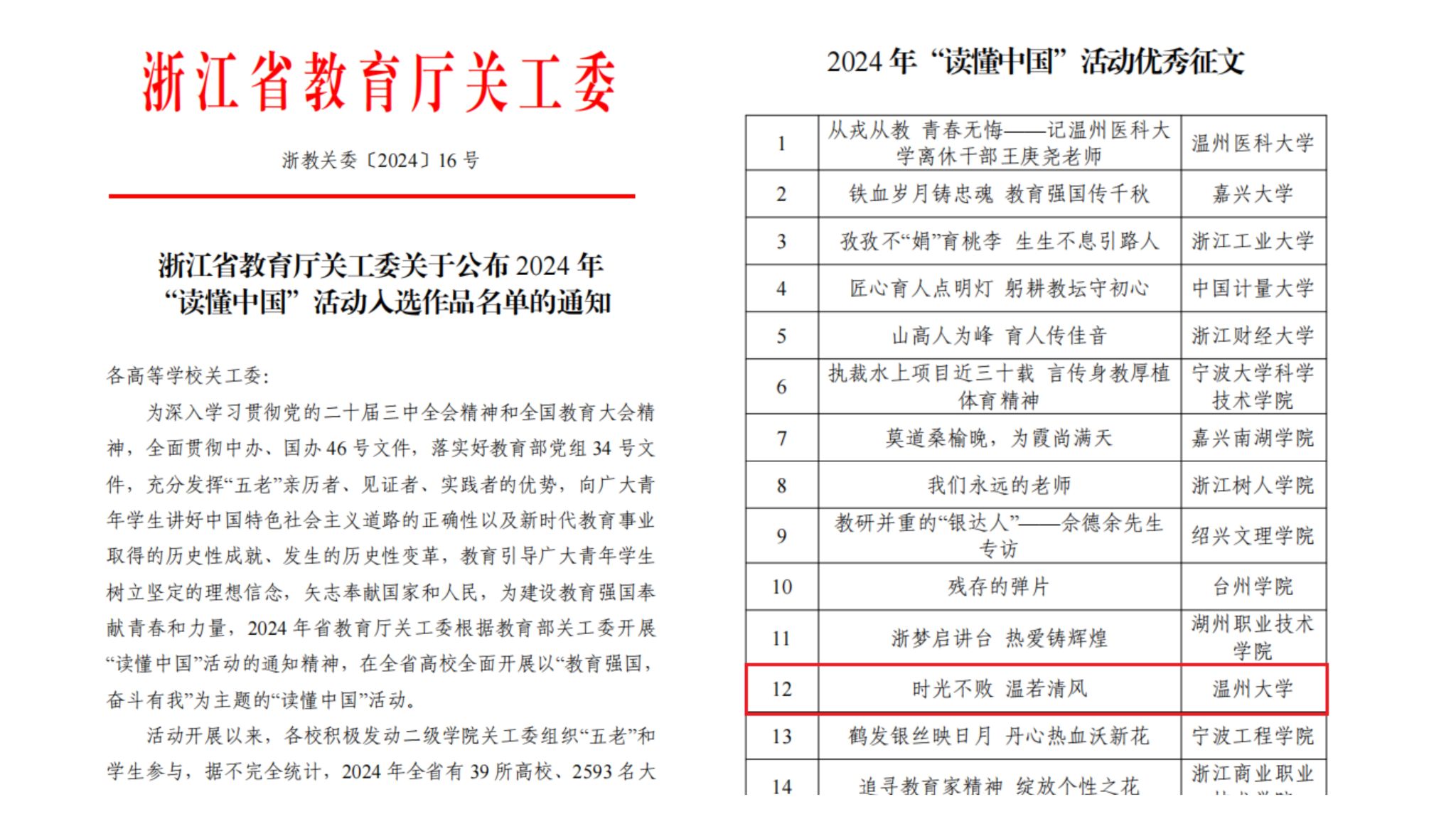 亚洲无码 离退休工作处精心组织推送的“时光不败 温若清风——原亚洲无码 魏萼清校长的教育情”文章,荣幸入选2024年“读懂中国”活动优秀征文名单。