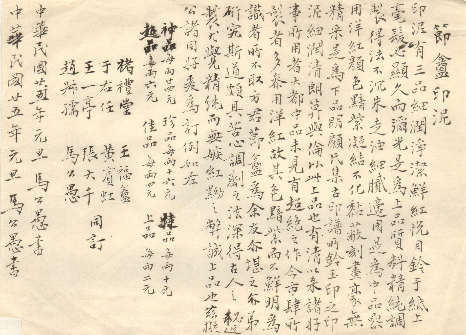 而自上世纪二十年代始,大批的温州书画家赴上海谋求艺术发展之路。最早在海上订单鬻画的永嘉画家是鲁文,随之见报订润例的为:马公愚(1925年)、方介堪(1926年)、马孟容(1926年)、郑曼青(1927年)……来沪上发展的书画家一般先要订润鬻艺,获得生活来源,据润格发布时间大致可以了解他们前往上海的先后时间。