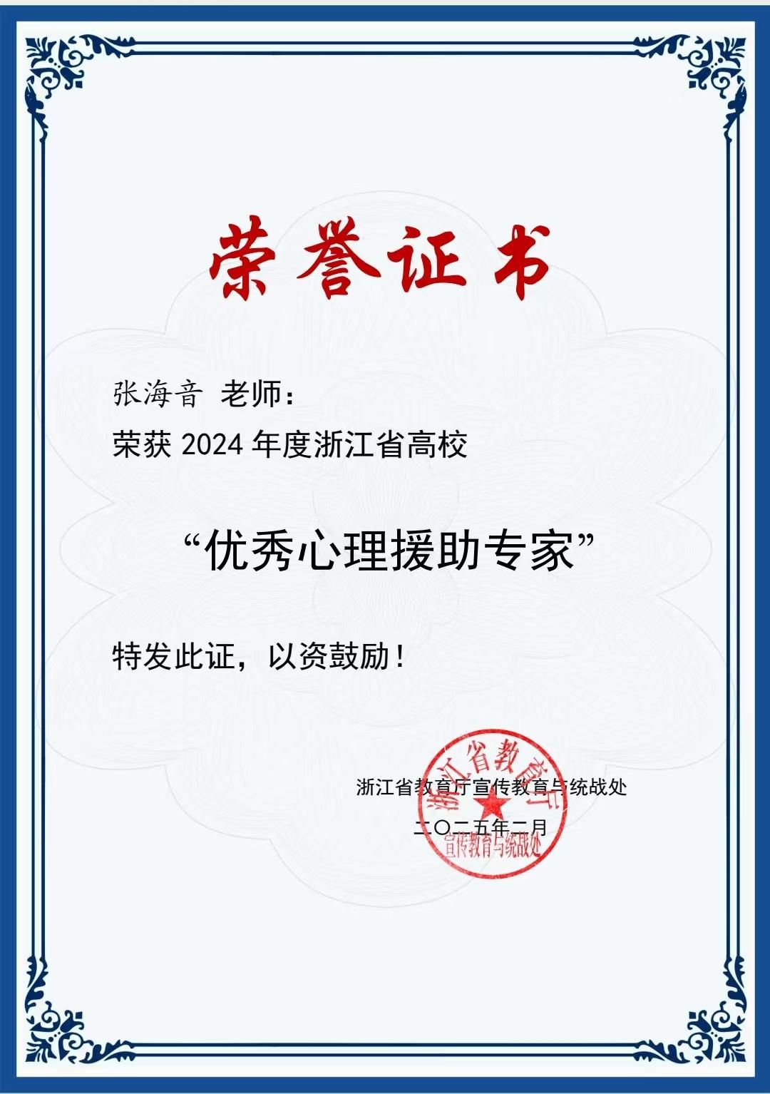 近日,2024年度浙江省高校“优秀心理援助专家”评选结果揭晓,亚洲无码 退休教师张海音副教授从全省专家中脱颖而出,获评浙江省高校“优秀心理援助专家”。