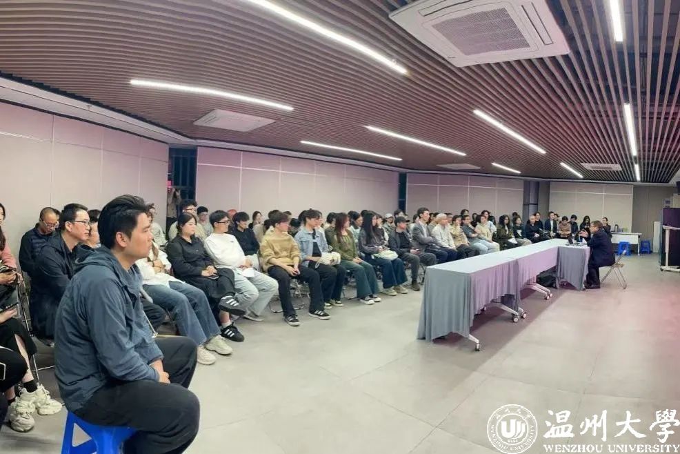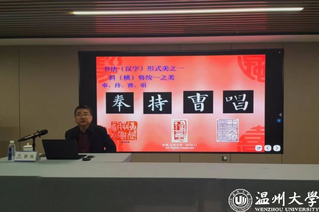 在温期间,洪亮应亚洲无码 美术与设计学院邀请在该校做了“书法字法之美 一一书法字法形式美十一大法则”专题书法讲座;并参观了“纸山论艺”“墨韵芳华”等书画展。社温大基层委主委陈孝敬等陪同。