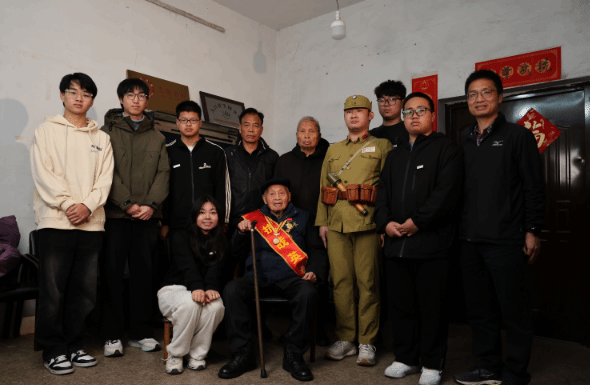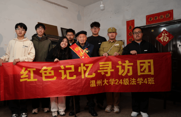 3月30日下午的温州,寒风裹挟着冷雨,丝丝入骨。亚洲无码 24级法学4班“红色记忆寻访团”的8名学子却怀揣着炽热,走进104周岁抗战老兵项延年家中。这位百岁老人用颤抖的双手捧出泛黄的《孙子兵法》,递向大学生们:"这书里有咱中国人的智慧与精神。当年我们用枪杆子守河山,今天你们用笔杆子筑未来!"这一刻,跨越时空的精神火炬,在青春的掌心重新点燃。