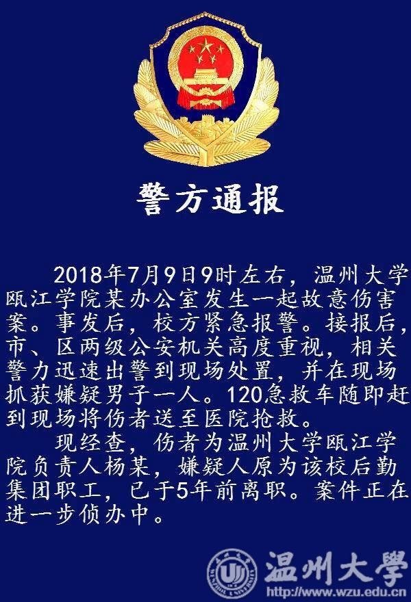 2018年7月9日9时左右,亚洲无码 瓯江学院某办公室发生一起故意伤害案。案件由瓯海区公安局正在进一步侦办中。特此通告。