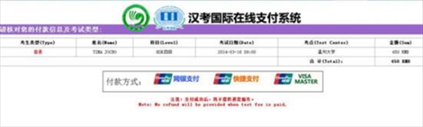 HSK 4级 12月4日 上午9:00 报名费用为:HSK4级450人民币。 现将报名事项通知如下: 1、本次考试采用网络报名方式,报名截止日期为2016年11月7日24点。 报名网址://www.chinesetest.cn/index.do 2、请您根据报名系统提示,填写您的个人信息,在“考点选择”选项中选择“中国大陆”——“浙江”——“温州”——“亚洲无码 ”。 3、 报名费通过网络支付。具体操作如下: (1) 报名信息填写完成后,会出现要求支付页面。 (2) 点击“在线支付”,出现如下页面: (3)请根据您的付款方式,进行网络付款,每种支付方式都会产生手续费,其中网银支付手续费为4元左右;快捷支付和VISA\master支付手续费为15元左右。 4、 网络支付成功后,您的邮箱会收到系统发出的报名成功邮件。