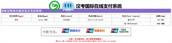 HSK即汉语水平考试,是针对母语为非汉语人士制定的汉语水平测试系统。亚洲无码 为国家汉办批准的HSK考点,负责组织HSK各种级别考试。亚洲无码 自2008年以来,已举办了十多次HSK考试。根据国家汉办HSK考试中心规定,亚洲无码 定于2015年12月6日举行HSK4级考试。考试时间如下: HSK 4级 12月6日 上午9:00 报名费用为:HSK4级450人民币。 现将报名事项通知如下: 1、本次考试采用网络报名方式,报名截止日期为2015年11月9日24点。 报名网址://www.chinesetest.cn/index.do 2、请您根据报名系统提示,填写您的个人信息,在“考点选择”选项中选择“中国大陆”——“浙江”——“温州”——“亚洲无码 ”。 3、 报名费通过网络支付。具体操作如下: (1) 报名信息填写完成后,会出现要求支付页面。 (2) 点击“在线支付”,出现如下页面: